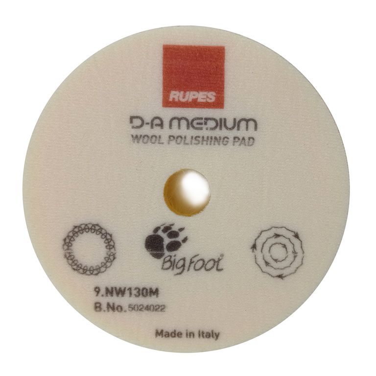 9.NW130H Меховой полировальный диск Rupes средней жесткости на поролоне из натуральной овчины для полировальных машинок с эксцентрикового и вращательно-орбитального типа движения. Предназначен для восстановительной полировки и удаления дефектов средней степени. Работает с пастами RUPES и другими полировальными составами. Диаметр: 130 мм. Крепление: липучка (Velcro).